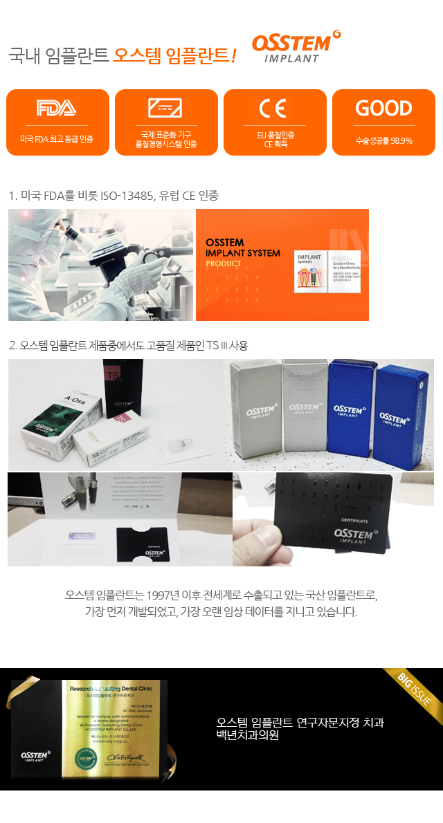 오스템 임플란트는 1997년 이후 전세계로 수출되고 있는 국산 임플란트로 가장 먼저 개발되었고 가장 오랜 임상 데이터를 지니고 있습니다.